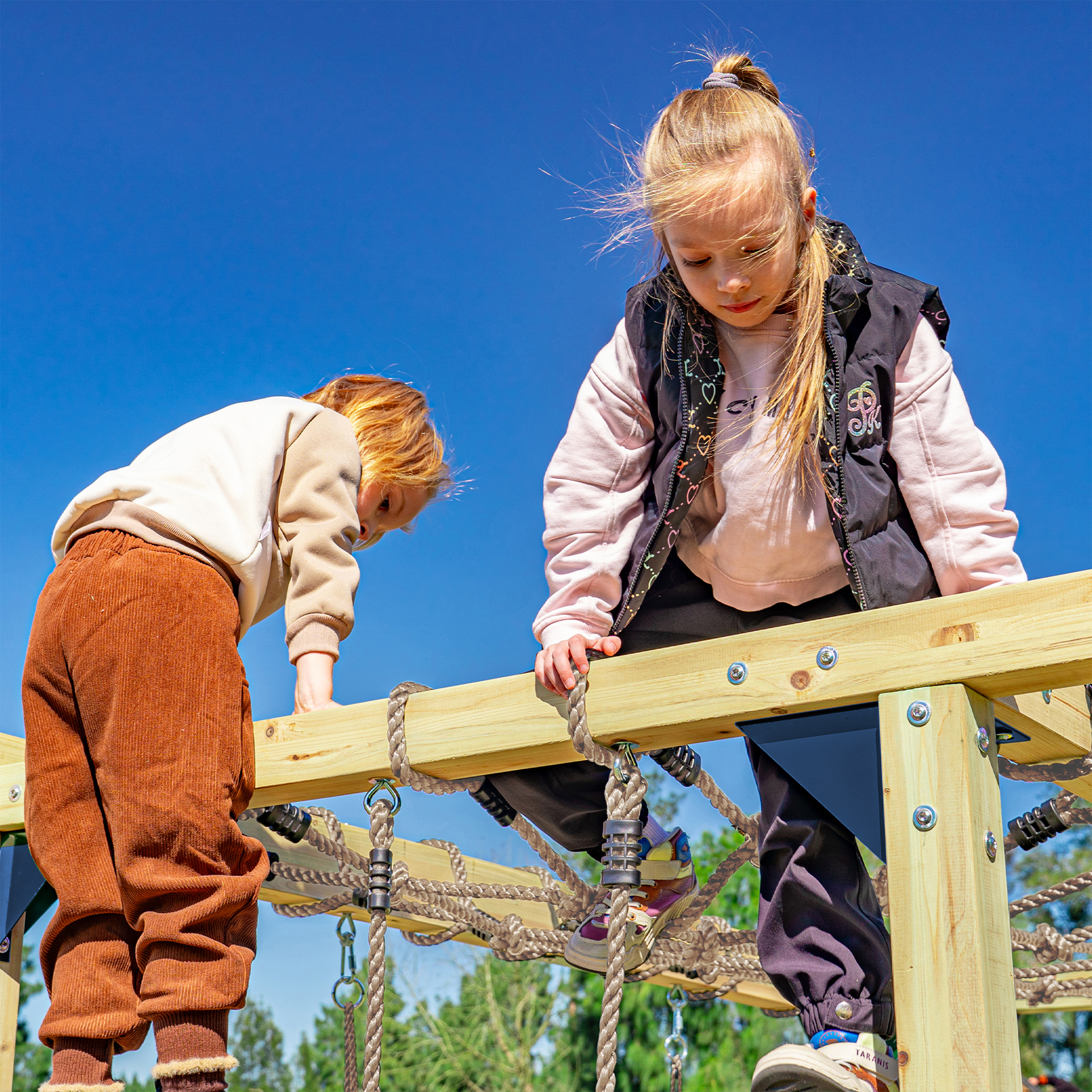 - Monkey Bars, knudestige, rebstige og klatrenet giver ekstra muligheder for rigtige klatrere.