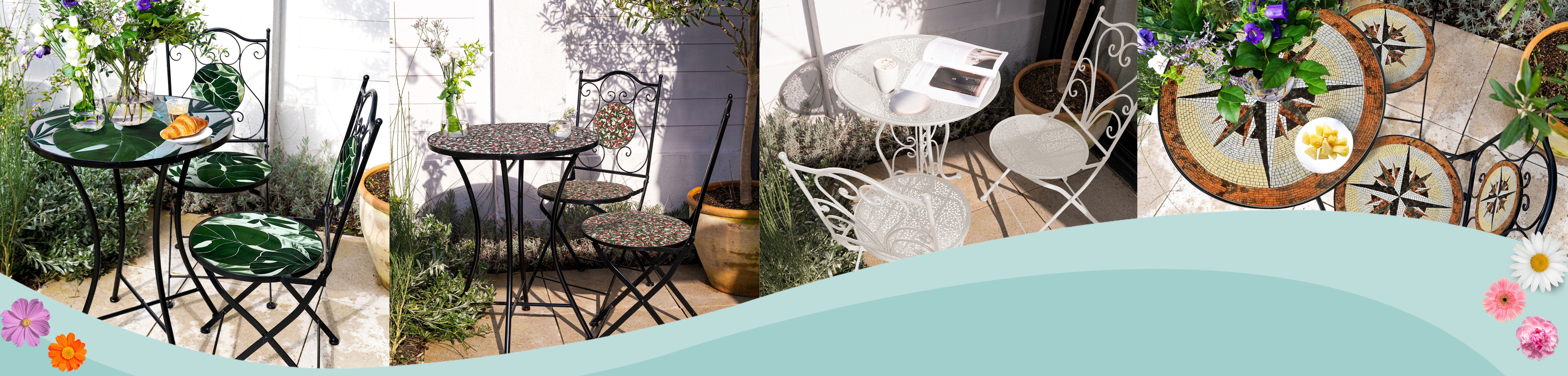 Med et bistrosæt giver du et tomt hjørne af din have øjeblikkelig karakter. Camilla-bistrosættet med sit blå og gule mosaikmønster giver et strejf af middelhavsflair. Perfekt til en stille kop kaffe i morgensolen eller et glas vin sidst på dagen. Placer sættet, hvor du kan få mest muligt ud af forårssolen - tænk på et hjørne af din terrasse eller en lysning blandt blomstrende planter.